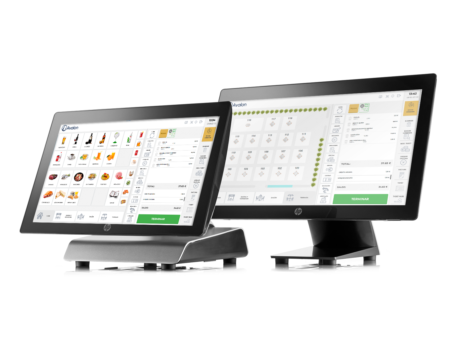 Plano de sala, cafetería, ticket, medios de pago.